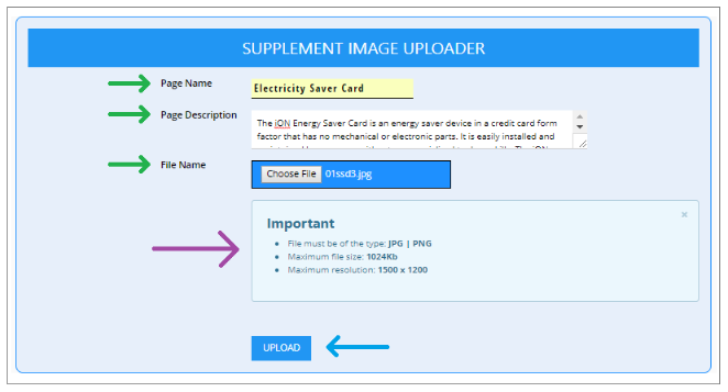 As illustrated by the green arrow to click on the blue ADD ADDITIONAL IMAGES button. You will be redirected to the SUPPLEMENT IMAGE UPLOADER. Below is an illustration depicting how the page looks like.