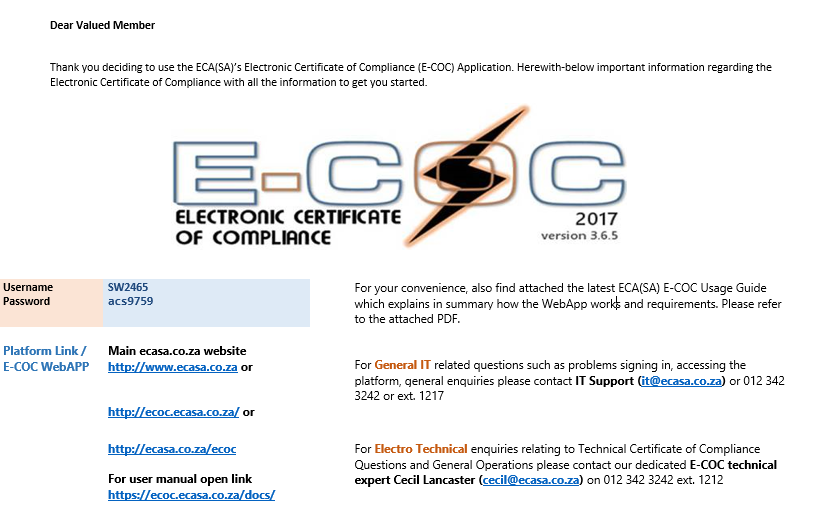 • If you are an existing user of the E-COC you can simply do an EFT payment and forward your proof of payment regarding your purchase to your Regional ECA(SA) Office.